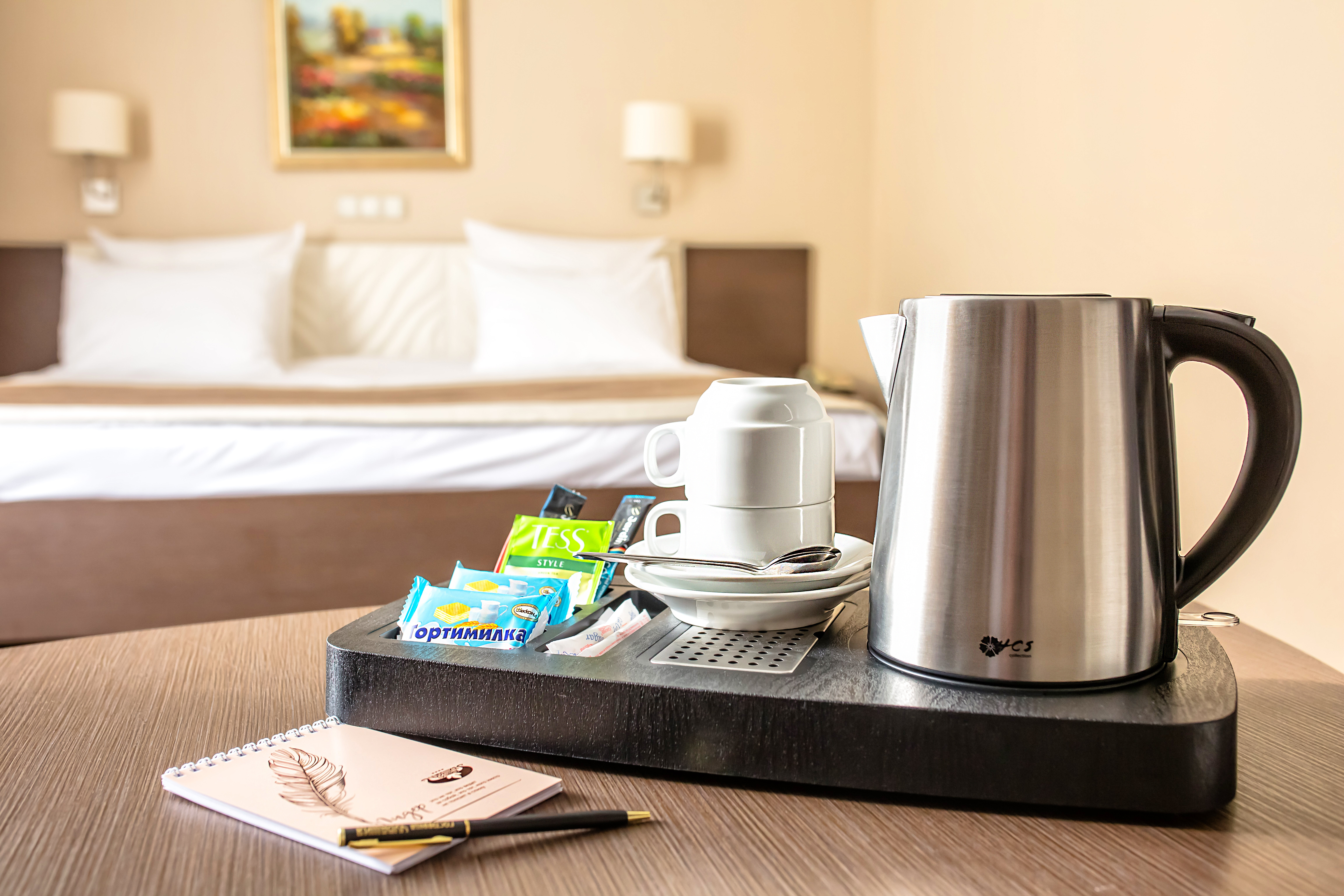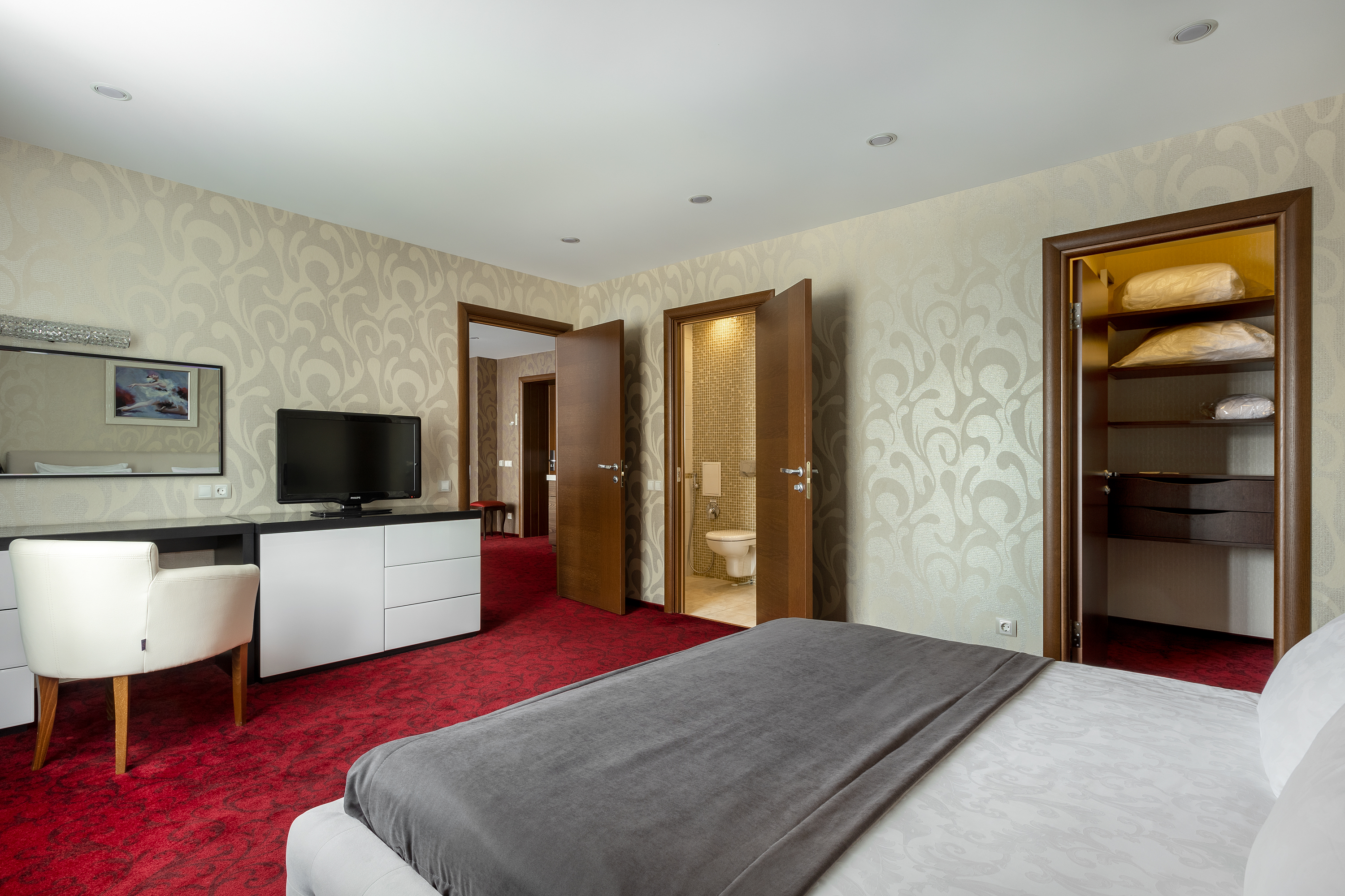 Комплектация номера полностью соответствует стандарту 4-х звездочного отеля. Все необходимые аксессуары для работы и отдыха включены в стоимость номера.