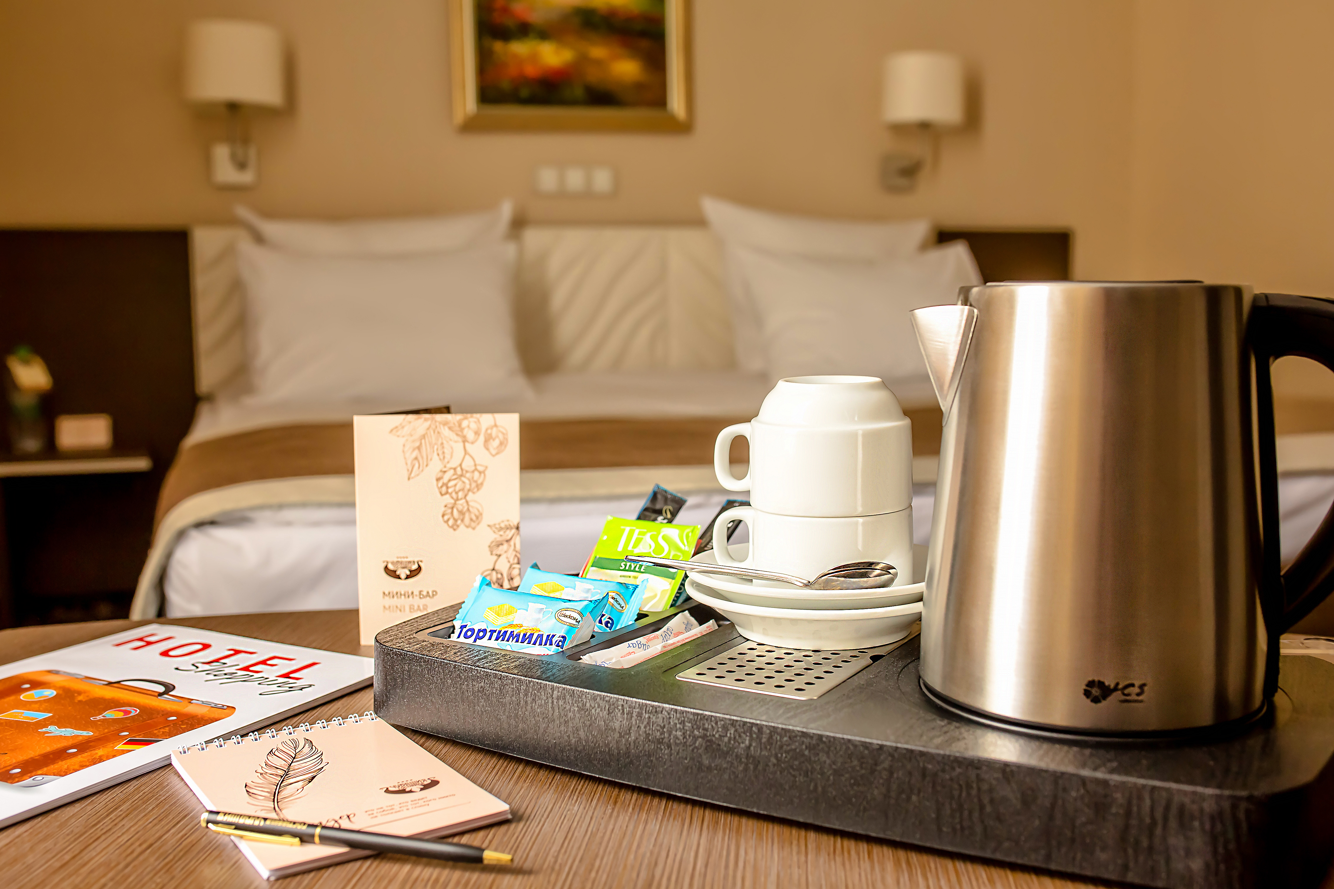 Комплектация номера полностью соответствует стандарту 4-х звездочного отеля. Все необходимые аксессуары для работы и отдыха включены в стоимость номера.